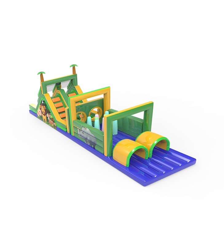 Esta pista de obstáculos infláveis vibrantes apresenta um tema divertido da selva com decorações de animais como leões e rinocerontes. Projetado para o desafio e diversão físicos das crianças, inclui rampas de escalada, túneis e vários obstáculos em um ambiente seguro e envolvente.
